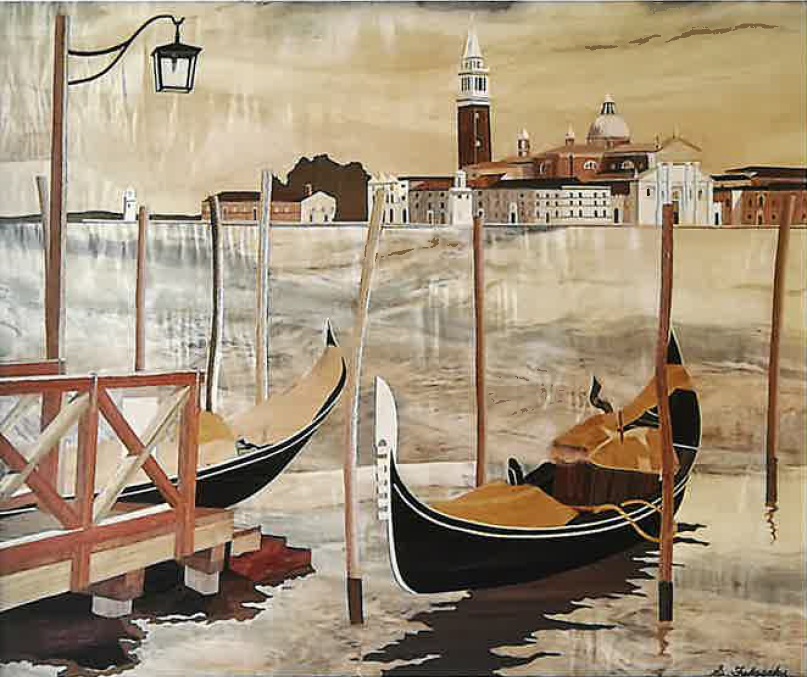 ひとつひとつの木片を丁寧に嵌め込んで生まれる表現は、遠くから見ると水彩画のような柔らかさがあり、近くで見ると木の質感が豊かに感じられます。