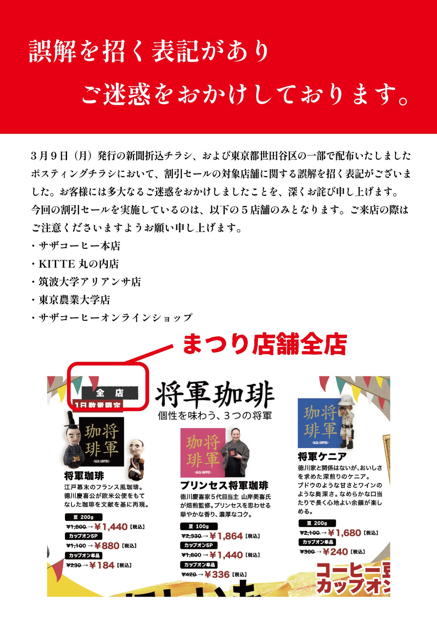 お取扱商品:ギフト、 豆、 サザカップオン、 リキッドアイスコーヒー (ネルドリップアイスコーヒー、 エスプレッソアイスコーヒー、 将軍冷珈琲、 ストレートアイスティー) など