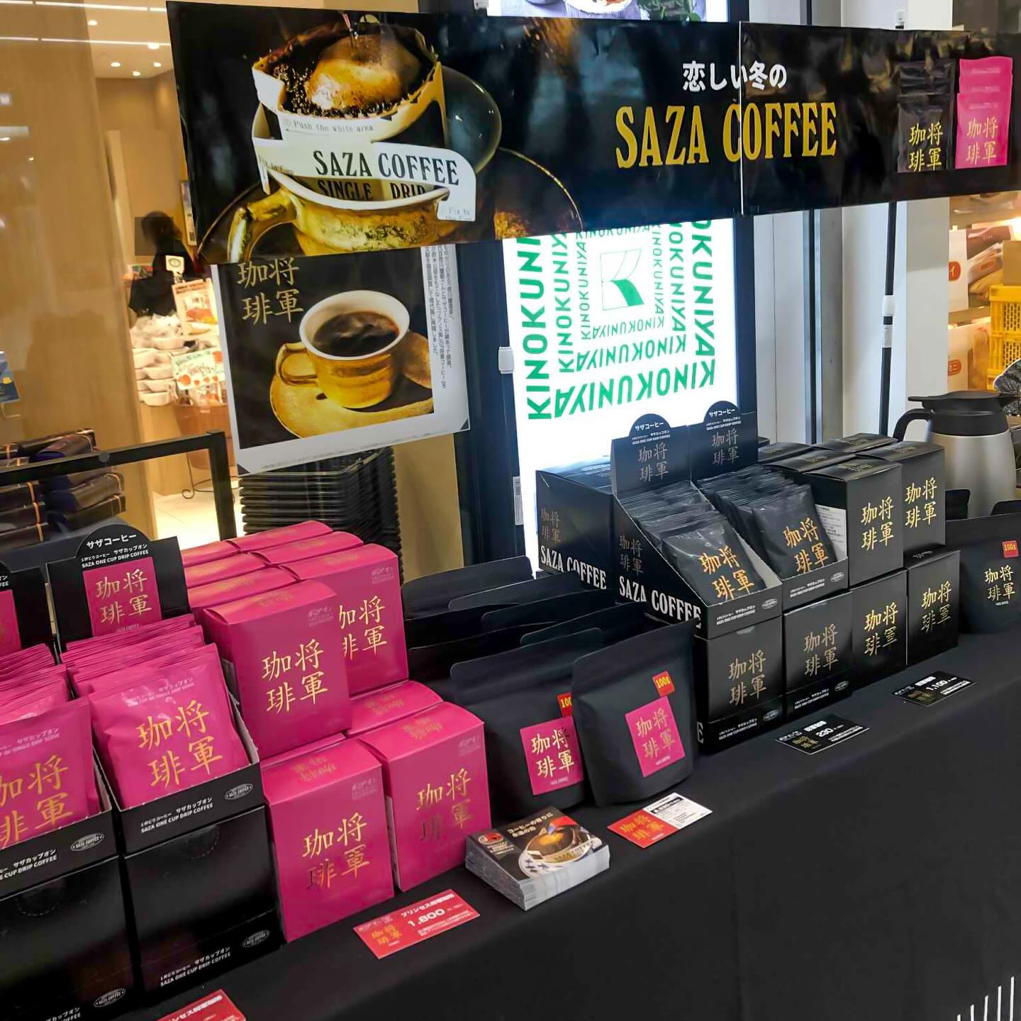 お取扱商品:サザカップオン単品 (将軍珈琲、 サザモカ、 ケニア、 サザスペシャルブレンド、 サザグァテマラ、 サザ贅沢ブレンド、 サザ農園コロンビア、 カフェインフリー)、 サザカップオンレインボー、 ネルドリップアイスコーヒー など